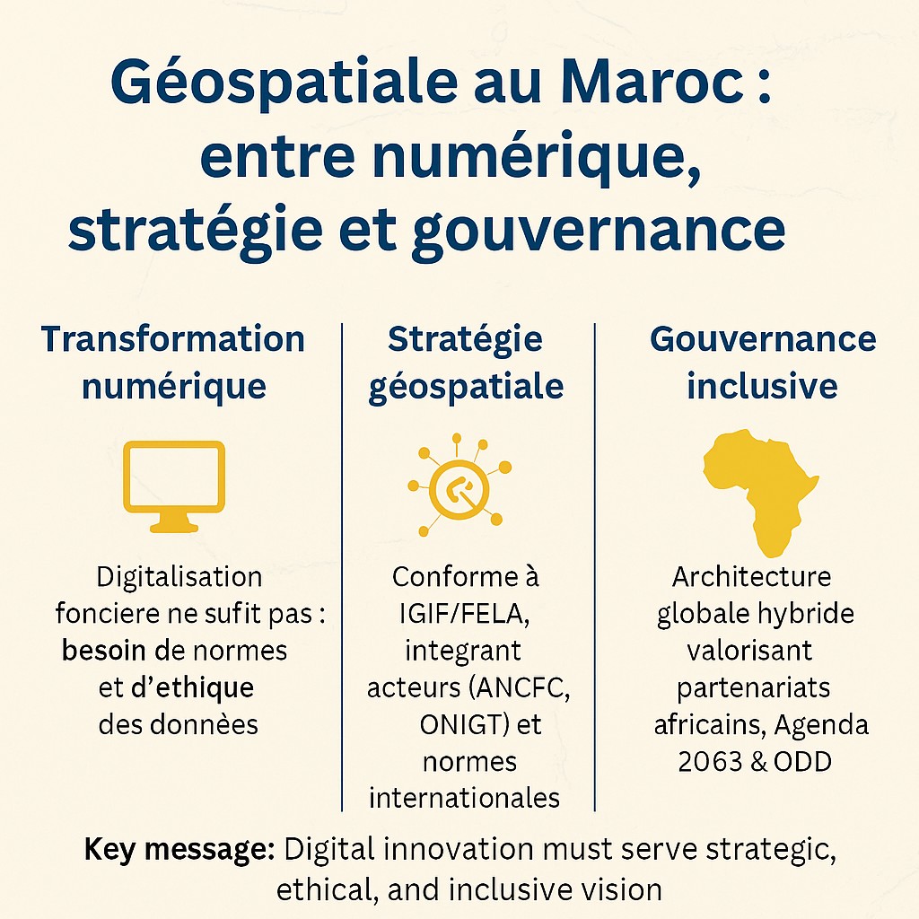 Ce triptyque – stratégie, gouvernance et technologie – doit guider la réforme géospatiale au Maroc et en Afrique. Il ne s’agit pas seulement d’innover, mais de construire un écosystème résilient, aligné sur l’Agenda 2063 et les ODD, selon les cadres, guides et normes internationales disponibles.