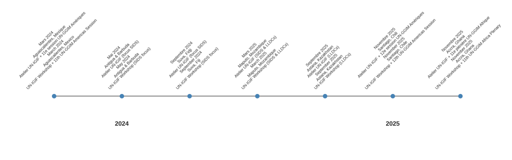Maputo, Mozambique (2025)24-28 mars 2025Atelier UN-IGIF Afrique australeUN-GGIM, UNECA, UN-GGKICAccent sur SIDS et LLDCs, lien avec Global Digital Compact et Agenda ABAS.