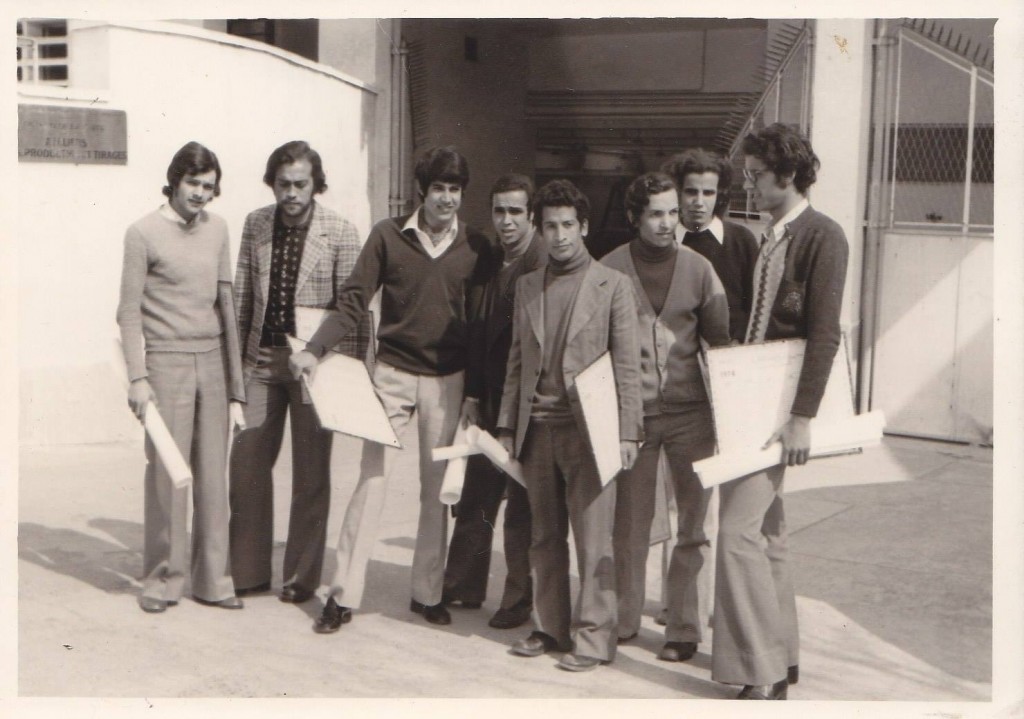 La première promotion d’Ingénieurs des Travaux Topographiques de l’IAVH II (1974) en visite aux ateliers de la division de la cartographie de la DCFTT (Feu A. Fakher-Eddine , deuxième à partir de la droite sur la photo ci-haut)