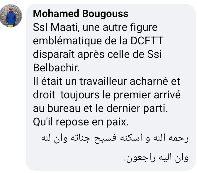 C’est avec une profonde tristesse que j’ai appris le décès de Monsieur Maati Bakkar, Ingénieur Général en retraite et ancien Directeur du Cadastre à l’ACFCC.