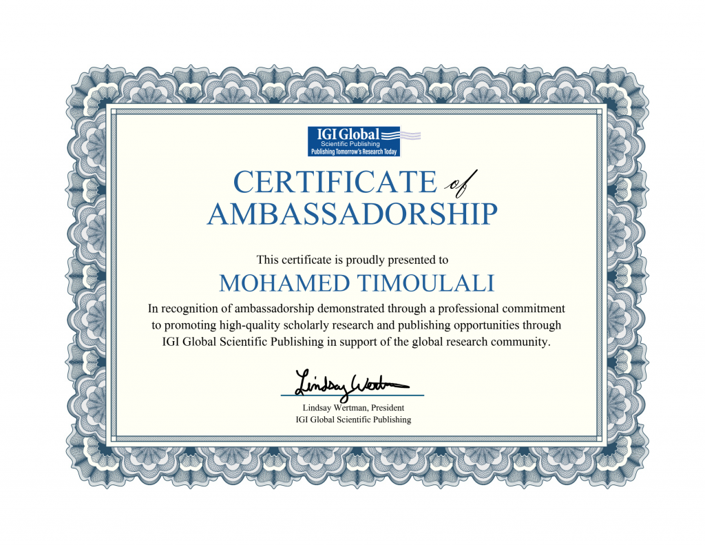 Mohamed Timoulali has been awarded the Ambassadorship Certificate from IGI Global Scientific Publishing, acknowledging his commitment to advancing high-quality scholarly research and expanding publishing opportunities for the global research community.